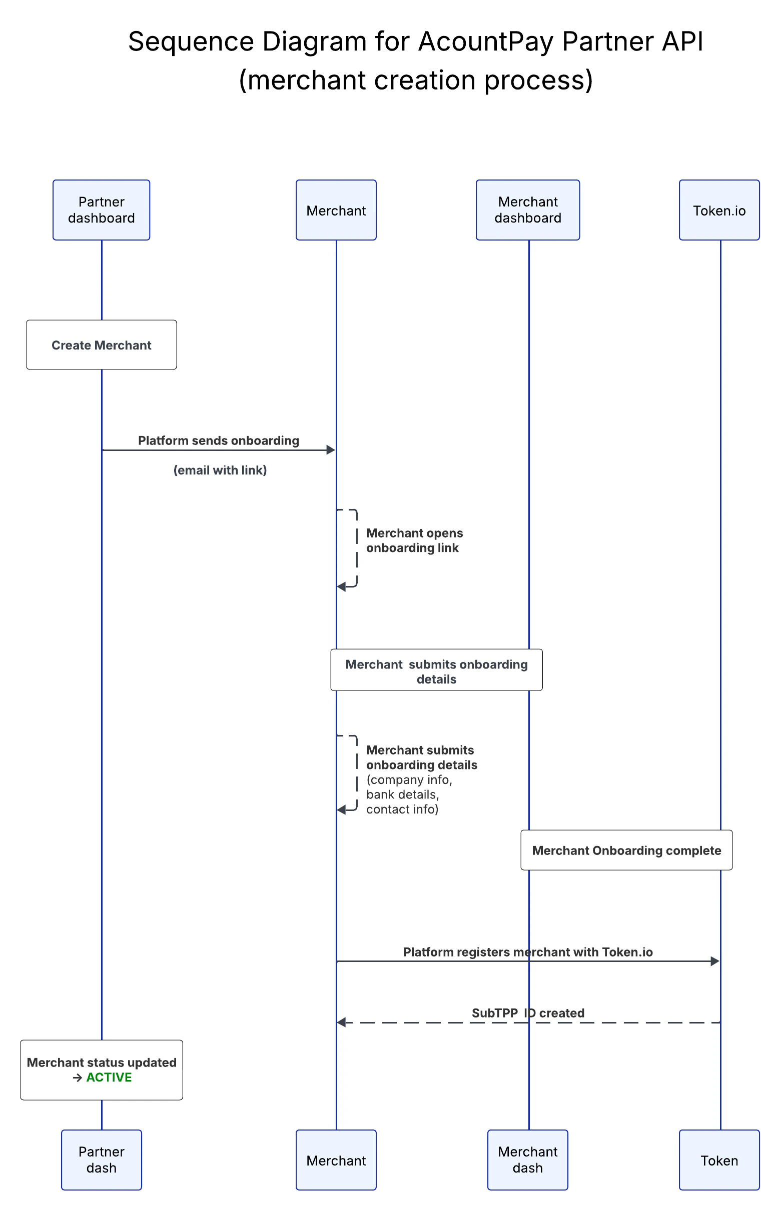 Use this endpoint when you already have full merchant and company data (e.g. from a migration or your own onboarding) and want to create the sub-TPP on Token.io immediately. The backend creates the merchant and sub-TPP in one call; the merchant only needs to complete the remaining steps (Billing agreement and bank account linking) via the returned onboarding link. Endpoint:POST /v1/partner/merchants/fast-track